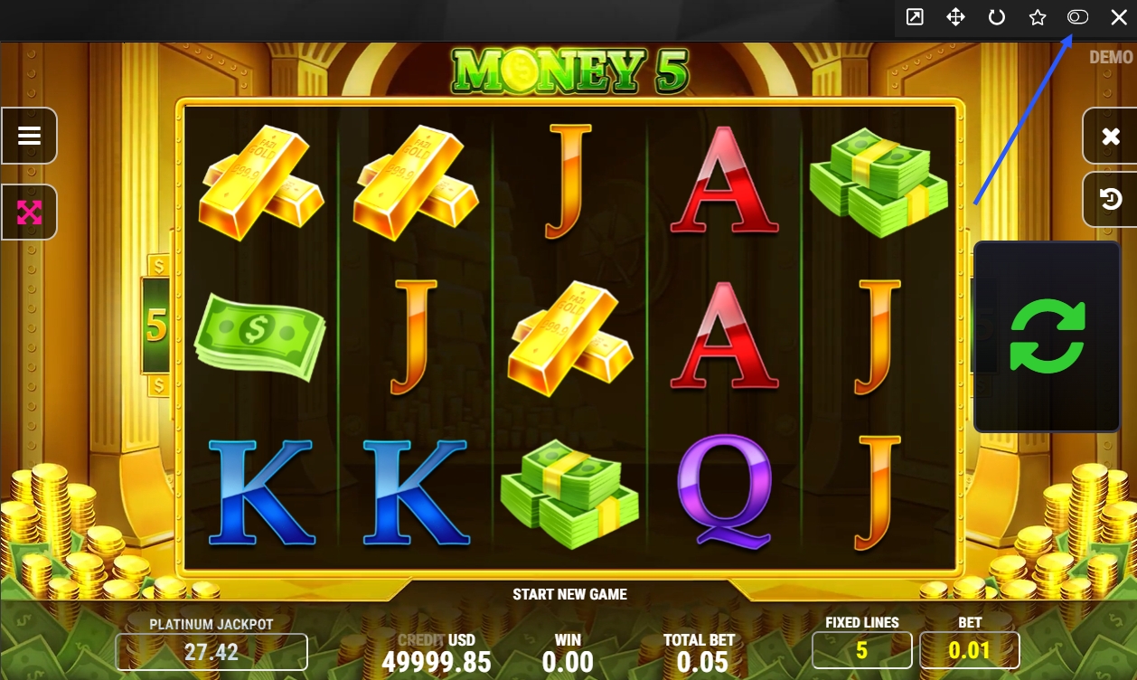 ডেমো মোড হল একটি ফ্রি সংস্করণ যা খেলোয়াড়দের স্লটের কার্যকারিতা বুঝতে এবং কৌশল পরীক্ষা করতে সাহায্য করে, বাস্তব অর্থ হারানোর ঝুঁকি ছাড়াই। ডেমো মোডে খেলার জন্য, গেমের মেনুতে "ডেমো" বাটনে ক্লিক করুন। যদি আপনি এই বাটনটি না পান, তবে স্ক্রীনশট অনুযায়ী সেটিংস পরিবর্তন করার চেষ্টা করুন। এটি একটি আদর্শ উপায় যে আপনি স্লটটি কিভাবে কাজ করে তা বুঝতে এবং বাস্তব বাজি রাখার আগে এটি অনুশীলন করতে পারেন।