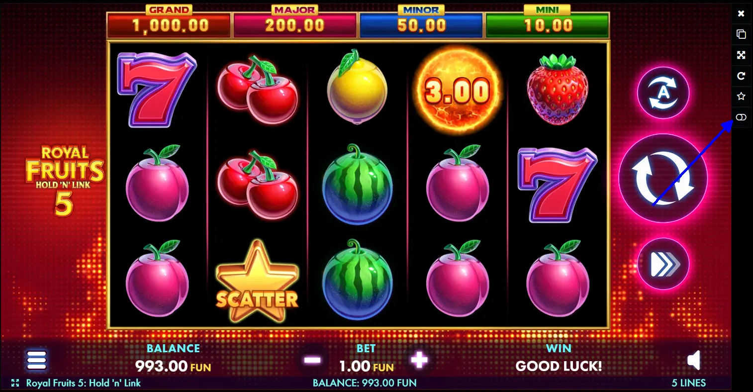 Royal Fruits 5: Hold 'N' Link oyun otomatikini gerçek para riski olmadan tanımak isteyenler için demonstraasyon modu mevcuttur. Bu mod, otomatiğin tüm fonksiyonlarını ve imkanlarını ücretsiz olarak denemenizi sağlar, bu da özellikle yeni başlayanlar için gerçek oyun başlamadan önce rahatça öğrenmek faydalıdır.