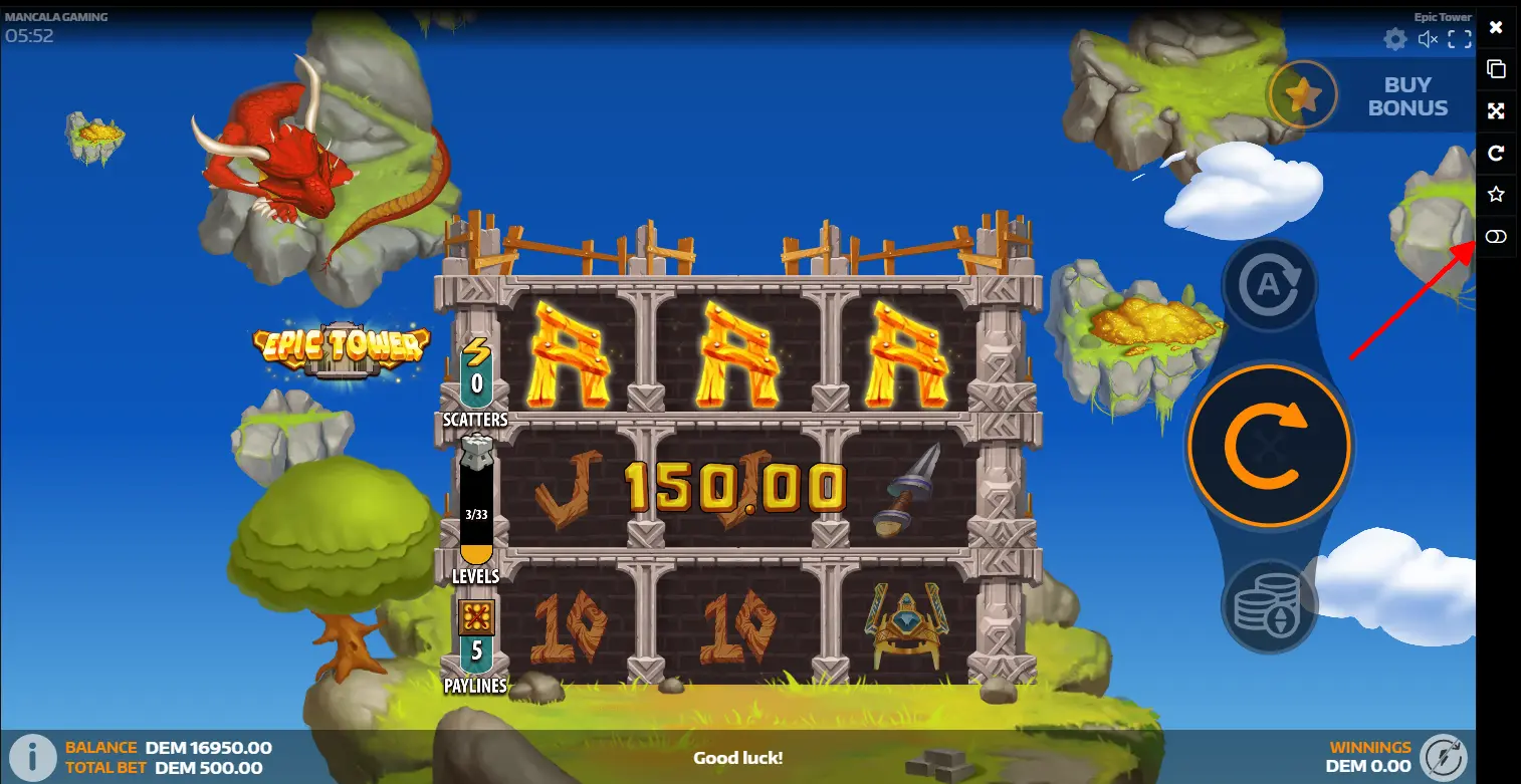 اگر آپ Epic Tower میں فری اسپنز اور دیگر بونس خصوصیات کا لطف جلدی اٹھانا چاہتے ہیں تو گیم میں "بونس خریدیں" کی سہولت دستیاب ہے۔ موجودہ شرط کے 70 گنا کے عوض آپ کو فوراً 8 مفت اسپنز مل جاتے ہیں۔ مثال کے طور پر، اگر آپ کی شرط 1 یونٹ ہے تو بونس خریدنے کے لیے آپ کو 70 یونٹس خرچ کرنا ہوں گے۔